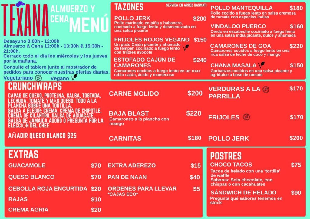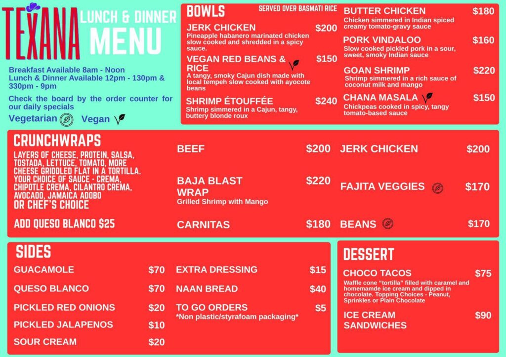 Texana offers CAJUN DISHES, INDIAN FOOD, their food truck classics such as CRUNCHWRAP SUPREME, DOUBLE DECKER TACOS, GRILLED STUFFED BURRITOS & their infamous CHOCO TACOS.