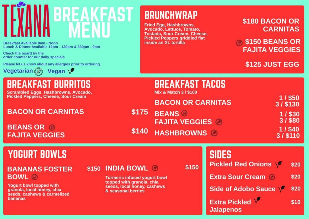 Breakfast: OPEN Fri 9am-1:30pm Sat 9am-1:30pm Sun 9am-1:30pm